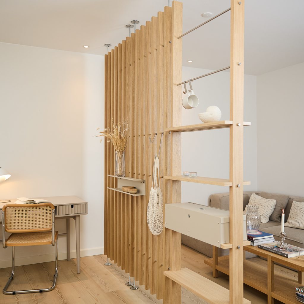 Room divider system that mounts between floor and ceiling. It creates clear zones and installs in just an hour.