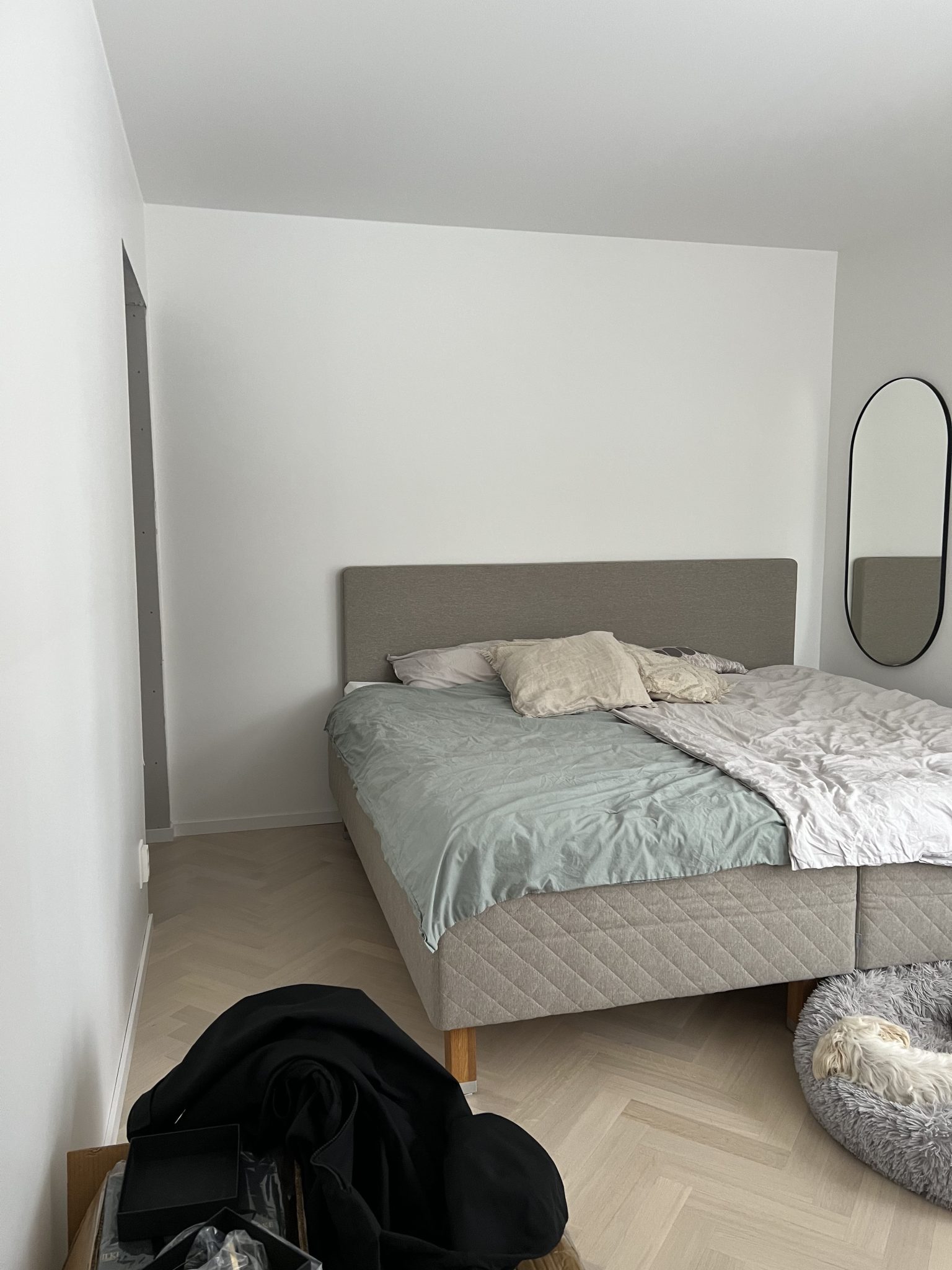 A plain white space with no visual anchor becomes a warm, balanced retreat. By cladding the end wall in classic oak with grey felt, the bed suddenly has something to lean into.