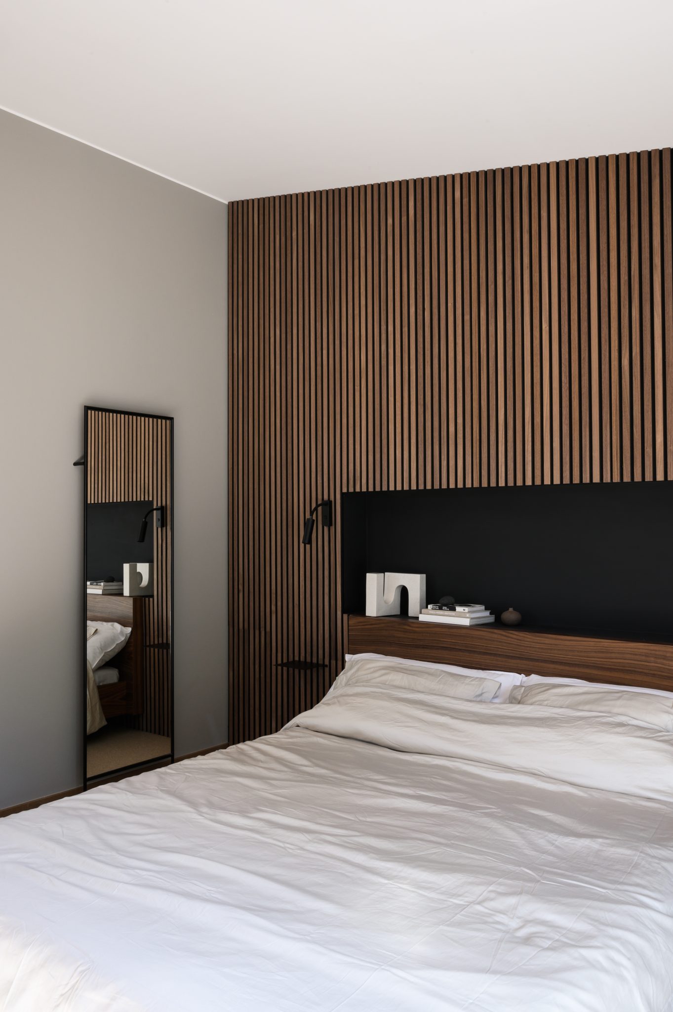 Using dark panels in the bedroom as well creates a sense of continuity throughout the home. The rich wood grounds the space and brings sensual balance — especially in modern homes with lots of white and light.