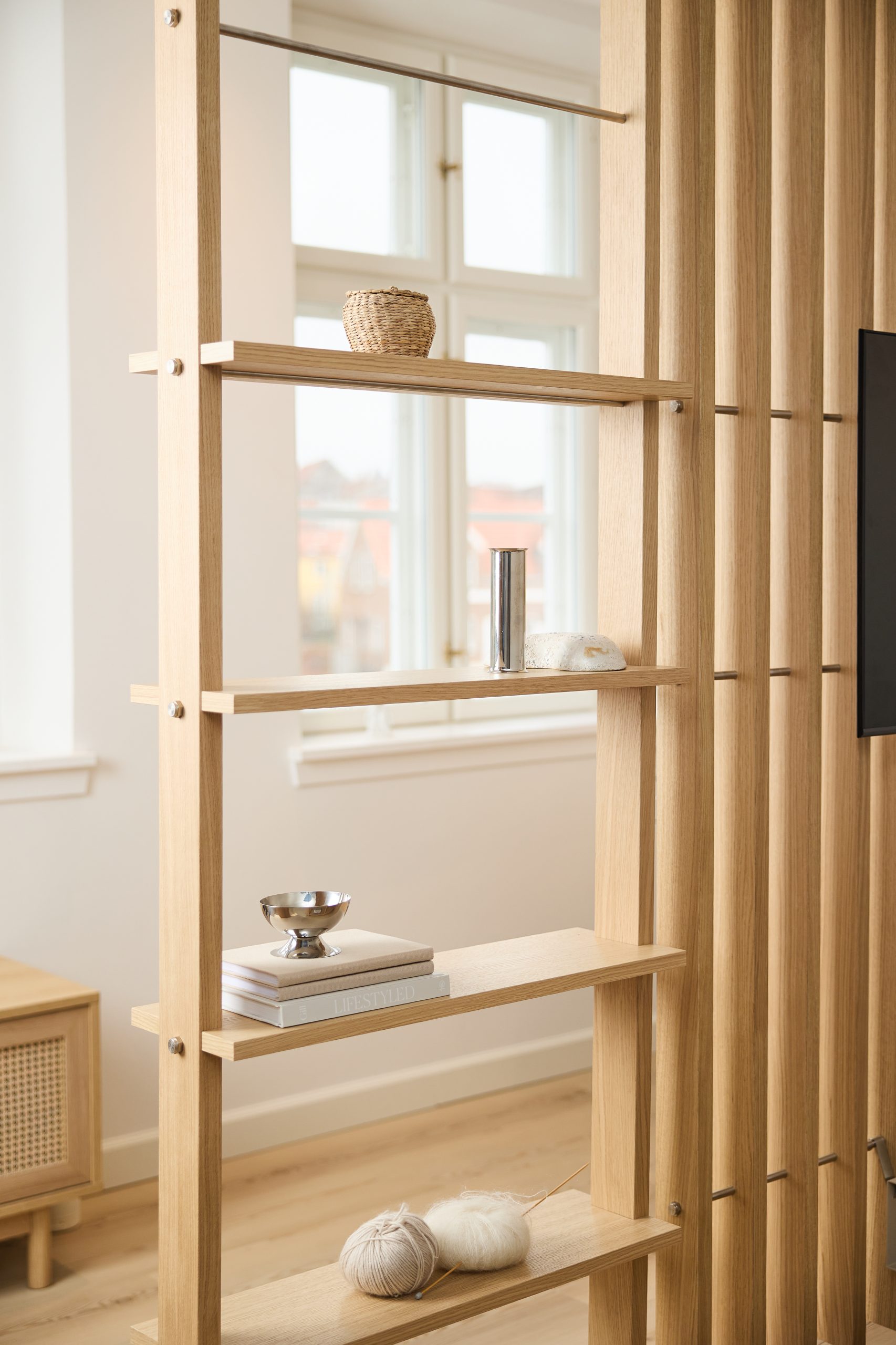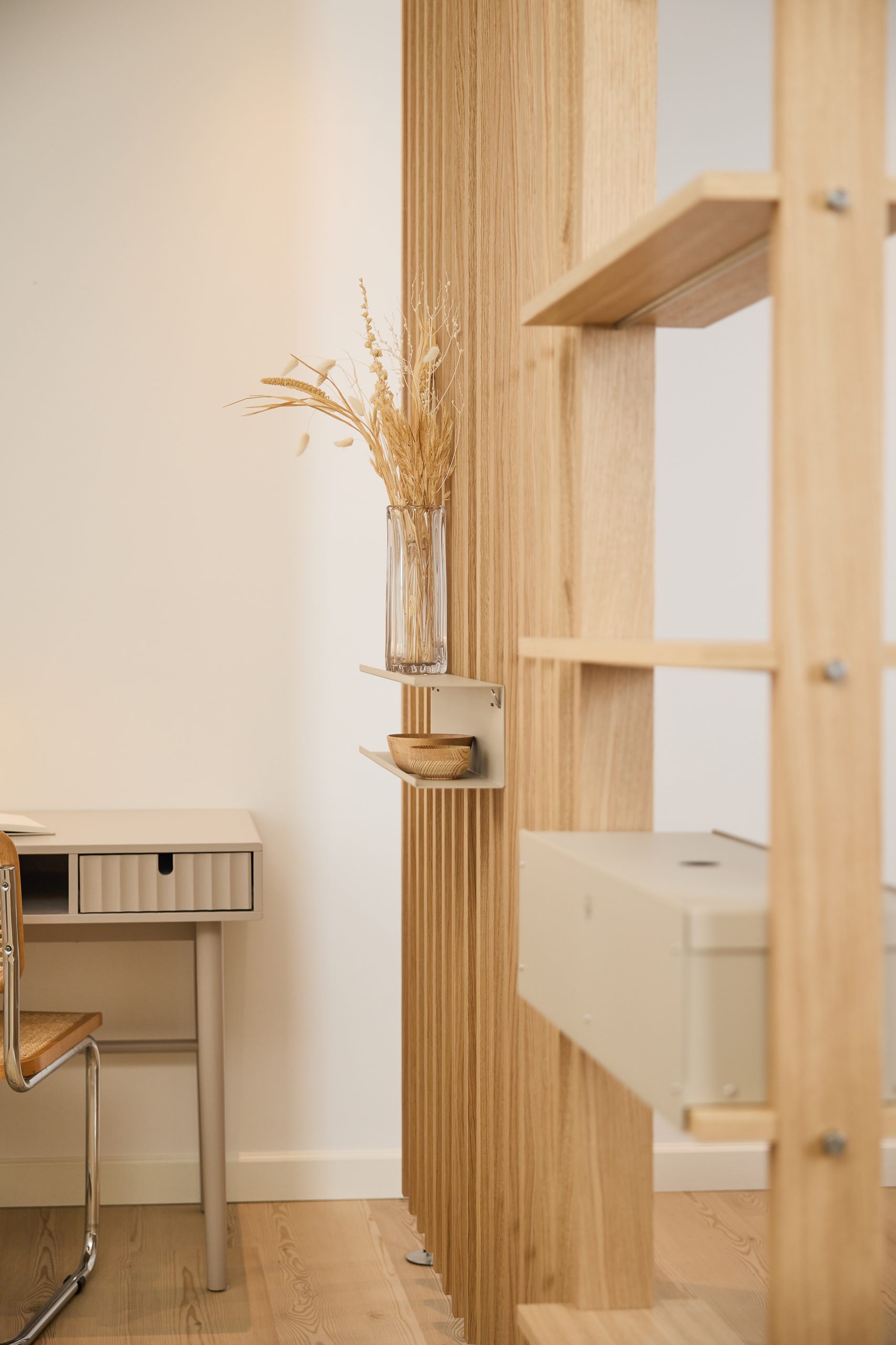 Built from natural oak veneer and brushed stainless steel, BM2 adds privacy and definition while keeping the space visually open. You can adjust the setup, reconfigure the layout, and add accessories as your needs change.