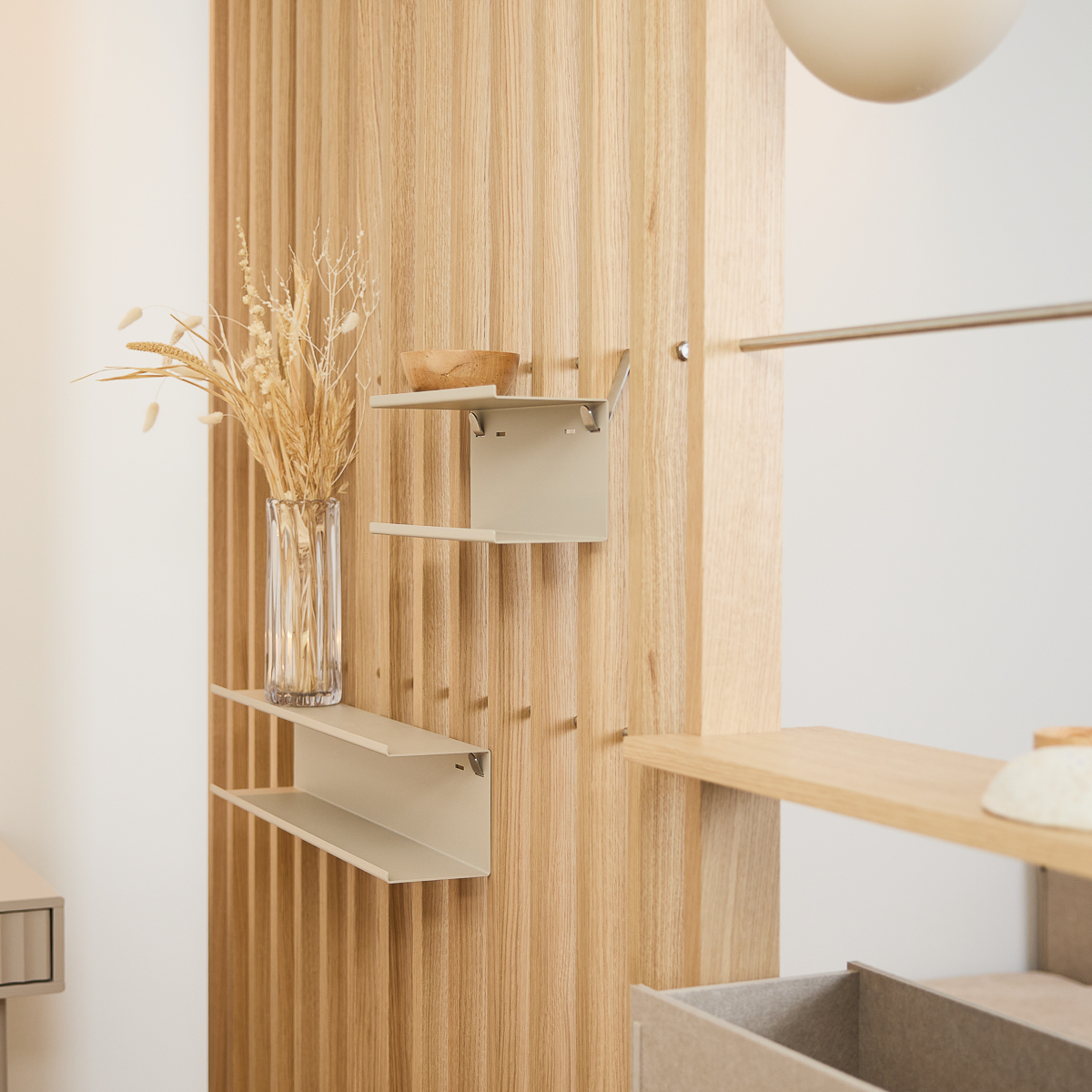 Use it for décor, everyday items, or small essentials—all neatly placed inside your Embrace room divider. The clean steel finish keeps the look light and calm, even with twice the storage.