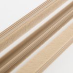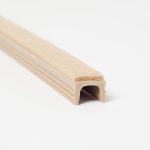 Close-up of a WoodUpp beige U-shaped plastic edge trim with an attached tan felt strip: a flexible channel profile designed to clip over doors or window edges, providing soft felt cushioning and draught-sealing. Textured ribs on the exterior and hollow interior are visible.