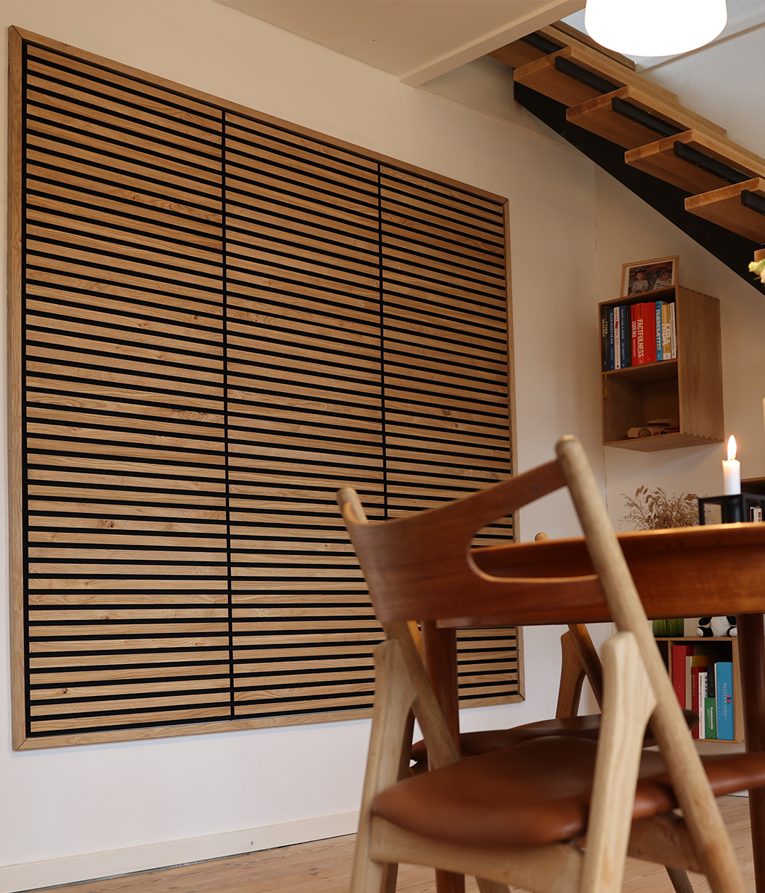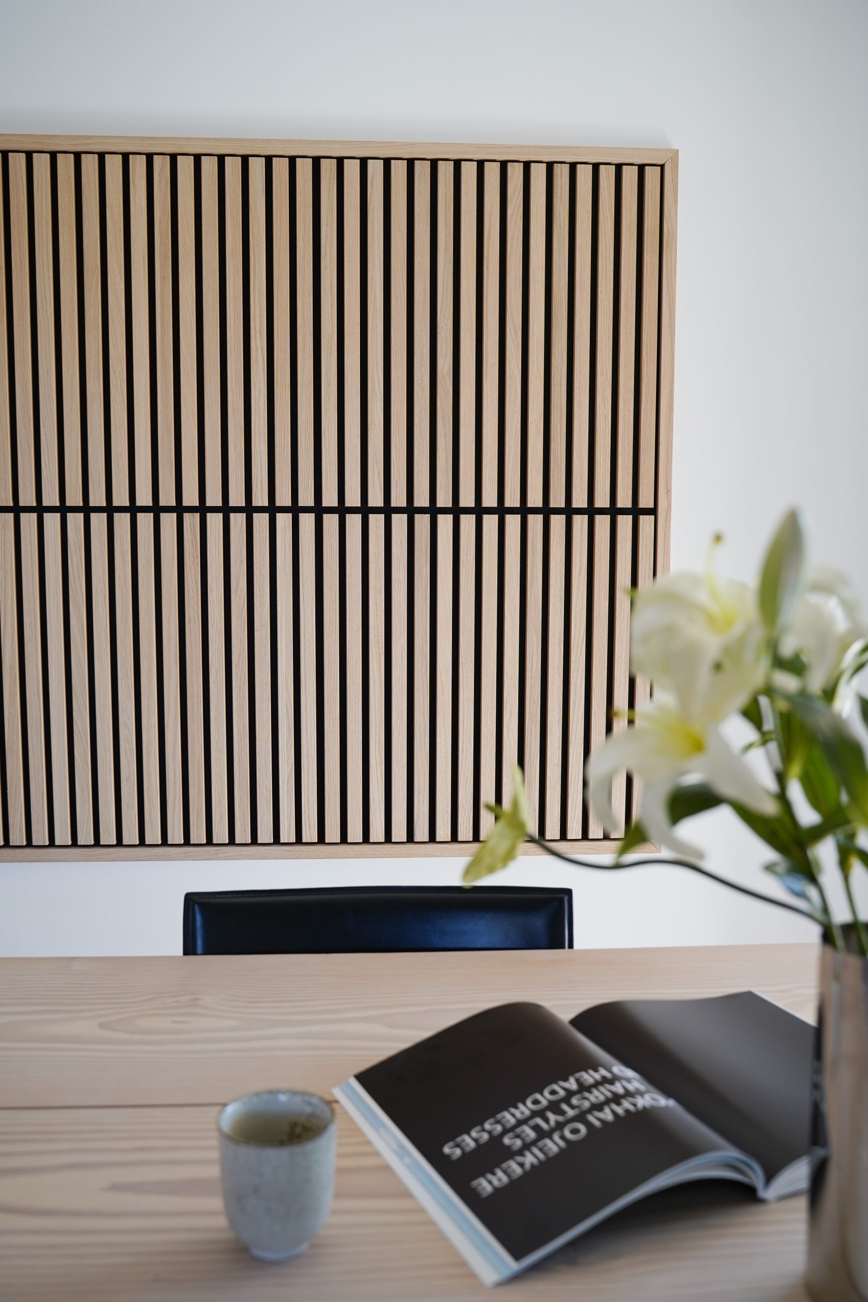 The Akutile delivers the same beautiful wood finish, acoustic function, and warm Scandinavian feel—now in a shorter format. It’s 60×60 cm, so it fits where the full-length Akupanels don’t.
