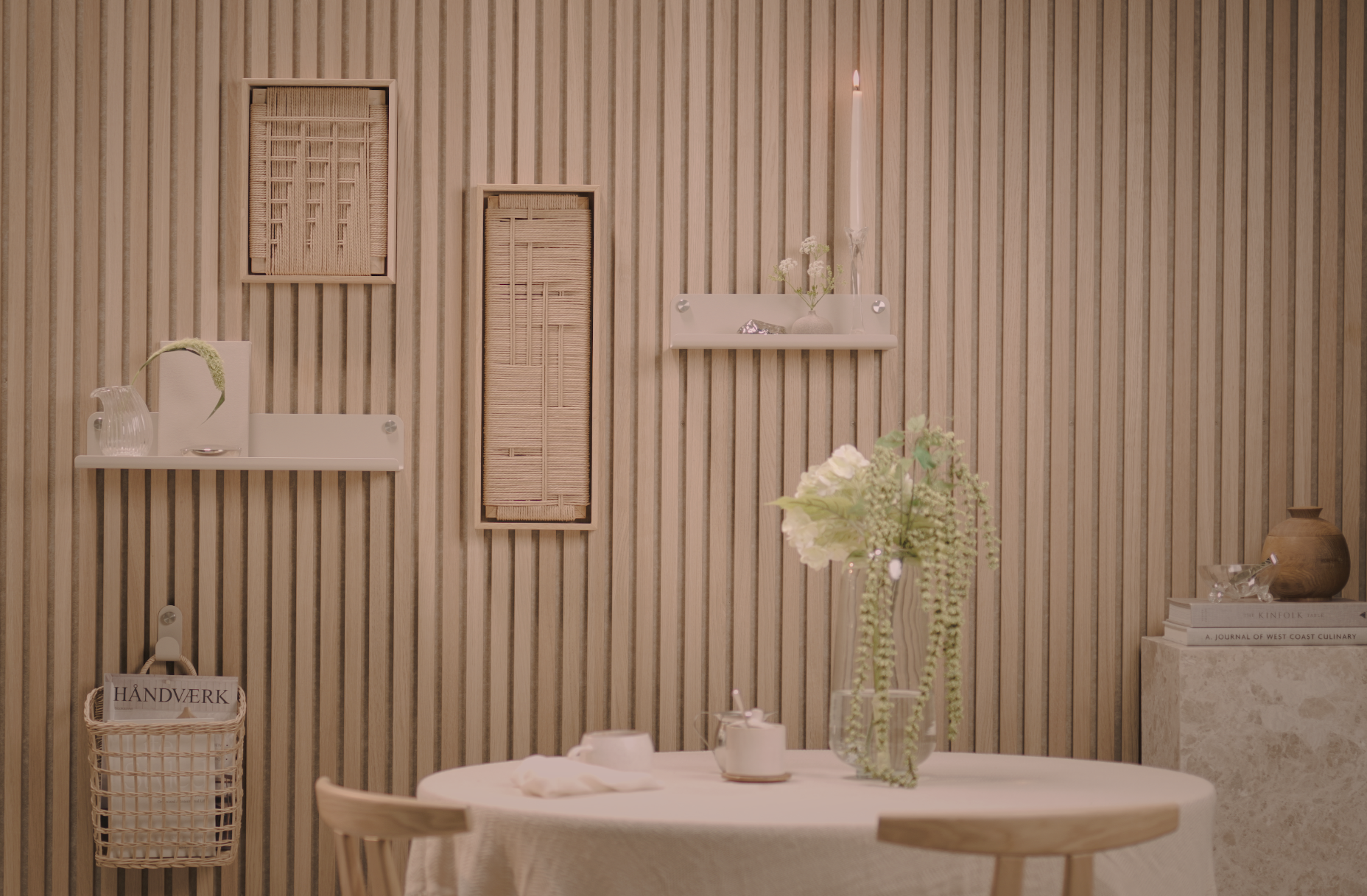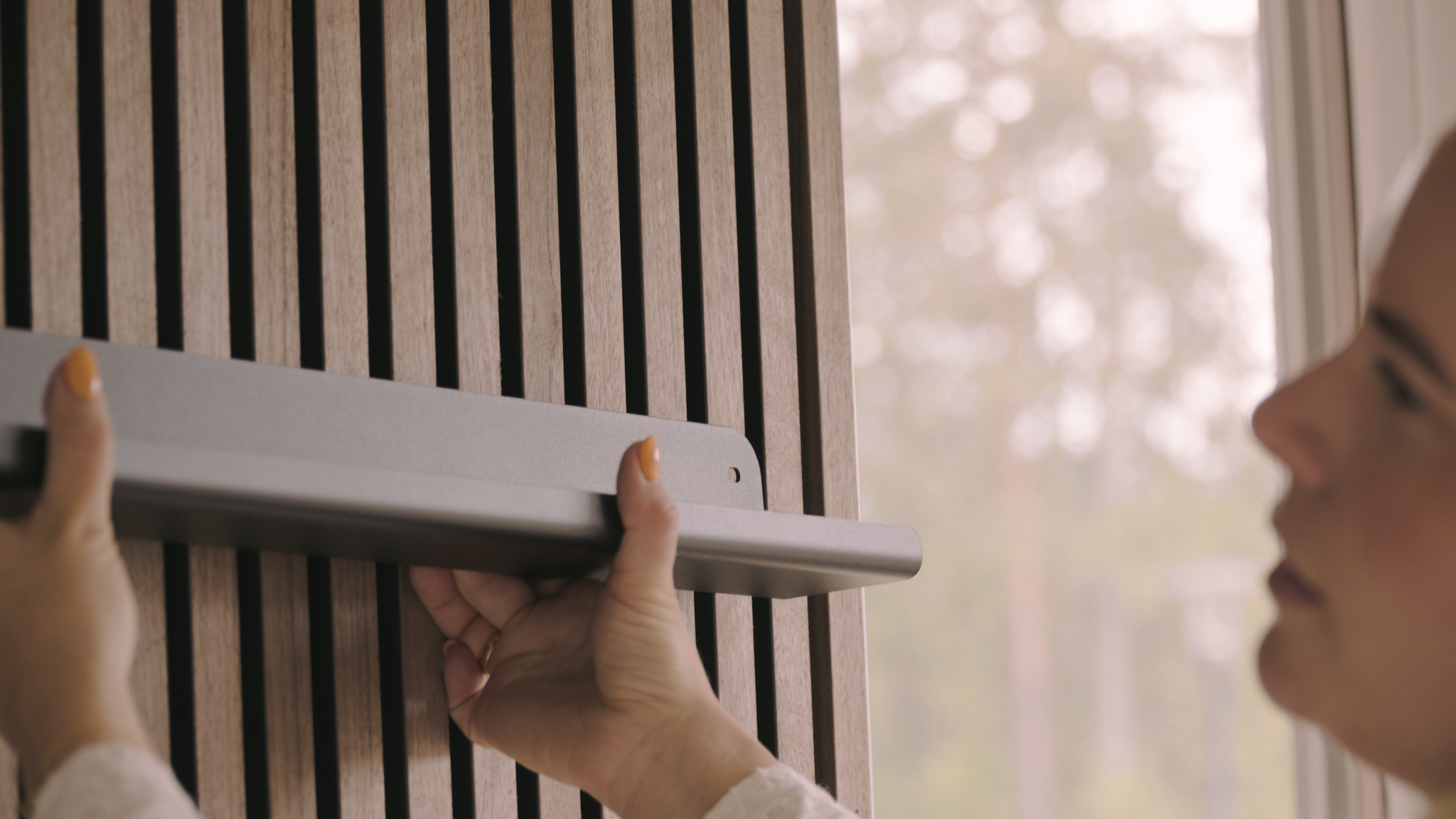 In 2019, Martin was helping a client with acoustic issues and ordered WoodUpp samples. While flipping through a newsletter, he noticed horizontal panels with mounted shelves and thought, “Why not hang directly from the panels?