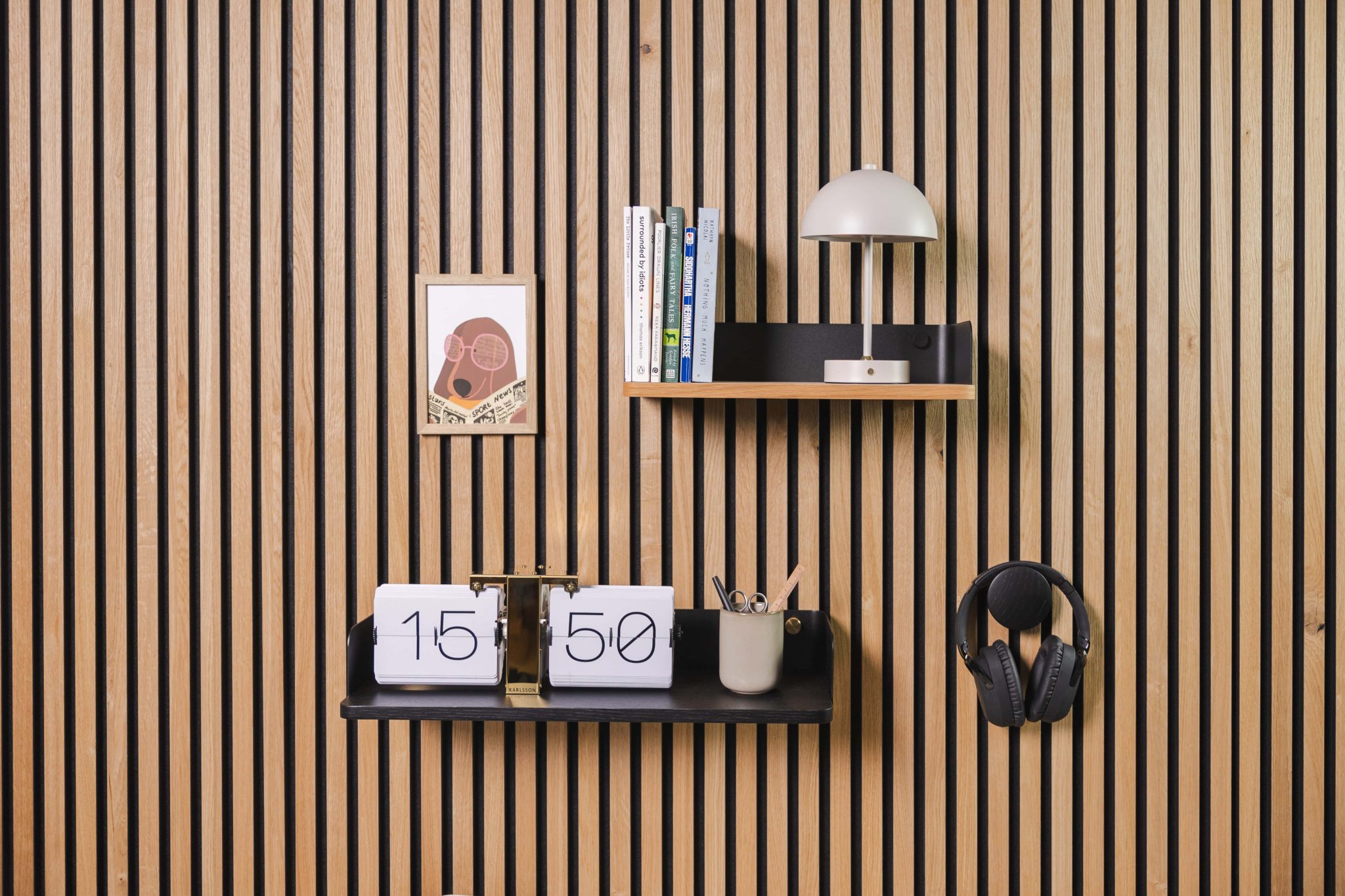 The Bookshelf is built from solid oak and powder-coated steel. It installs in minutes and mounts directly onto your Akupanels without tools.