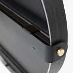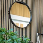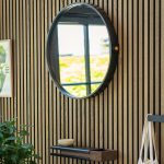 The WoodUpp Mirror is made from D23.622in premium glass with a durable plywood frame in natural oak or black veneer. Total width, including the side screws, is 24.724in.